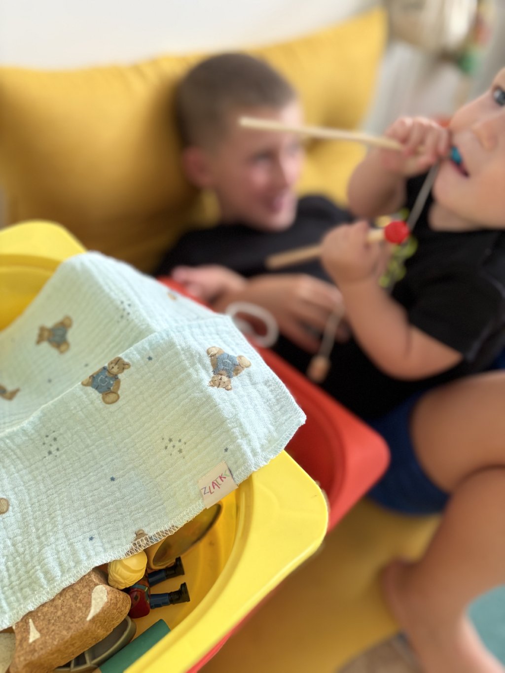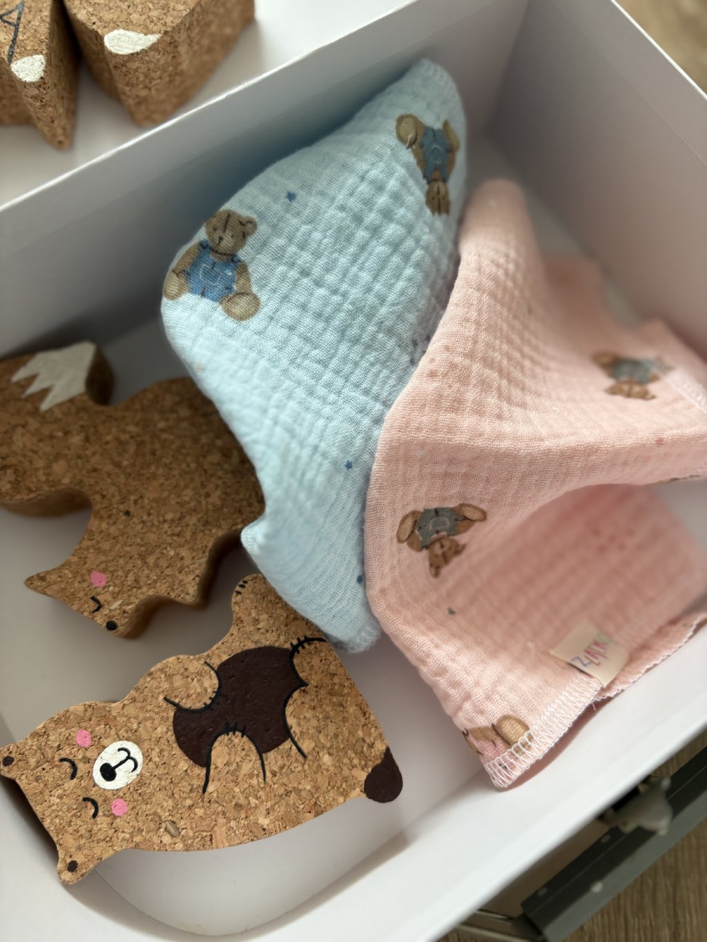 mušelínová vreckovka s rozmermi 30x30 so vzorom mackov na modrom podklade