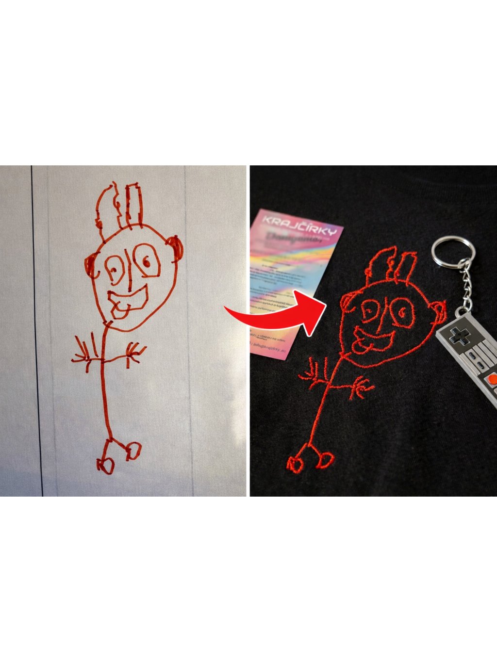 Premeňte detskú kresbu na originálnu strojovú výšivku priamo na tričku. Každý kus vyrábame na mieru podľa kresby vášho dieťaťa, s dôrazom na detail, trvácnosť a zachovanie detského charakteru kresby.